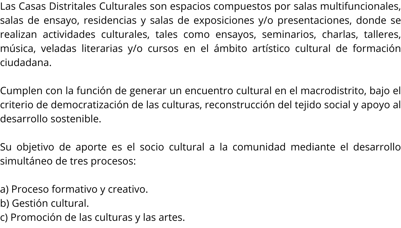 Las Casas Distritales Culturales son espacios compuestos por salas multifuncionales, salas de ensayo, residencias y salas de exposiciones y/o presentaciones, donde se realizan actividades culturales, tales como ensayos, seminarios, charlas, talleres, música, veladas literarias y/o cursos en el ámbito artístico cultural de formación ciudadana.