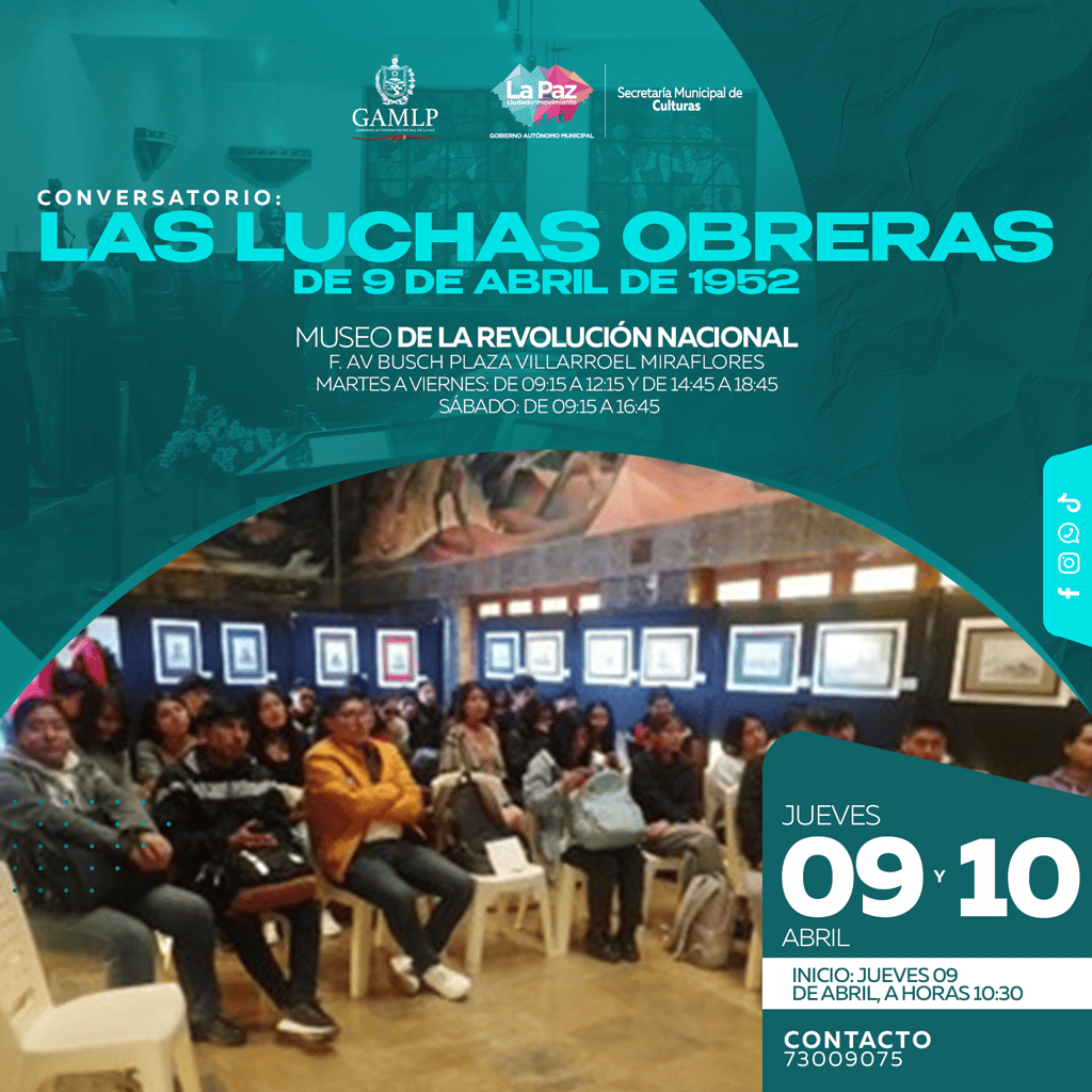 En conmemoración a los 74 años de la Revolución Nacional de abril 1952, se realizará dos conversatorios, sobre la Batalla del 09 de abril de 1952, los cuales estarán dirigidos a estudiantes de Unidades Educativas de Nivel Secundario, contando para ello, con la participación de profesionales y expertos en el tema como expositores.