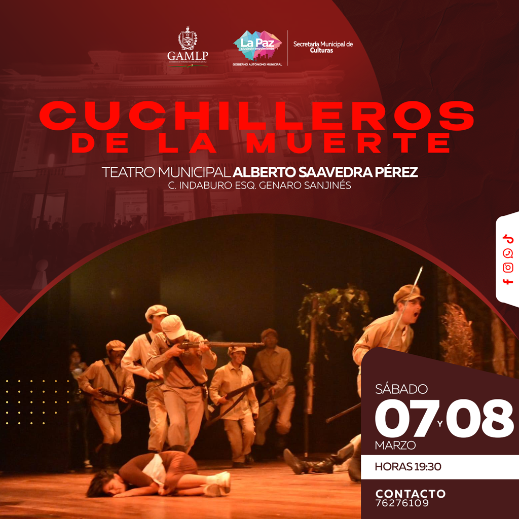 La obra “Cuchilleros de la Muerte” muestra en tres actos el drama, la tristeza, pero también el honor y el heroísmo del Regimiento 50 de Infantería, mostrando hechos reales como la entonación de la célebre cueca “Adiós Oruro del Alma”, himno del soldado boliviano durante el conflicto bélico, entre otros.