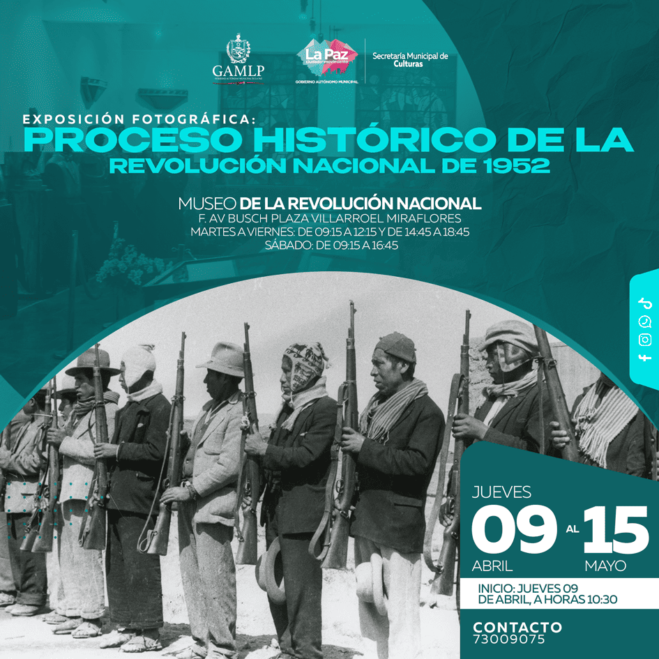 Muestra fotográfica compuesta por 22 imágenes en blanco y negro, sobre los principales pasajes y luchas sociales de la Revolución Nacional de 1952, en memoria de los caídos en el conflicto entre el Ejército y las clases populares.